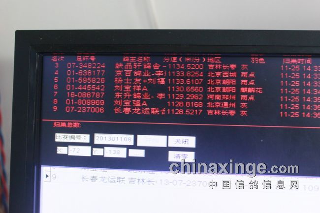 第一批赛鸽共有十二羽,于下午2时32分至37分进棚。随后的赛鸽陆陆续续地凯旋。这场决赛,除了第一梯队十羽左右成批飞归外,几乎没有成批,大都是一羽羽,个别是三三两两的飞回。