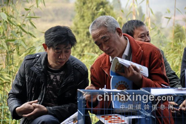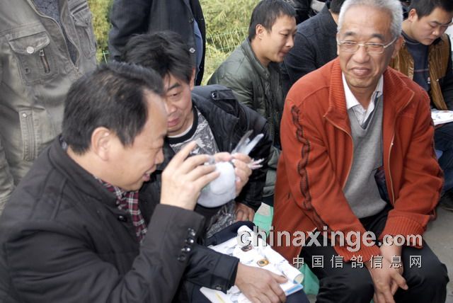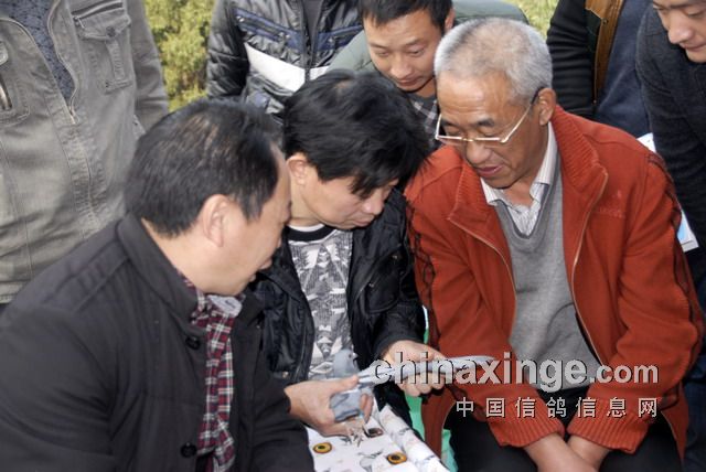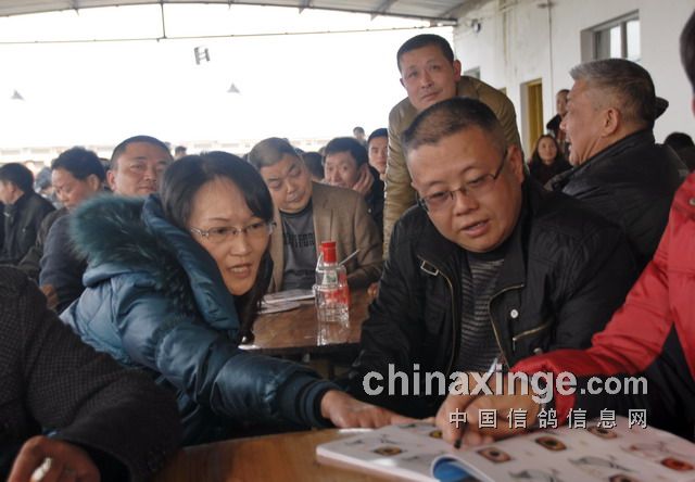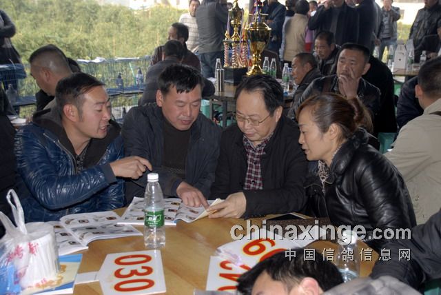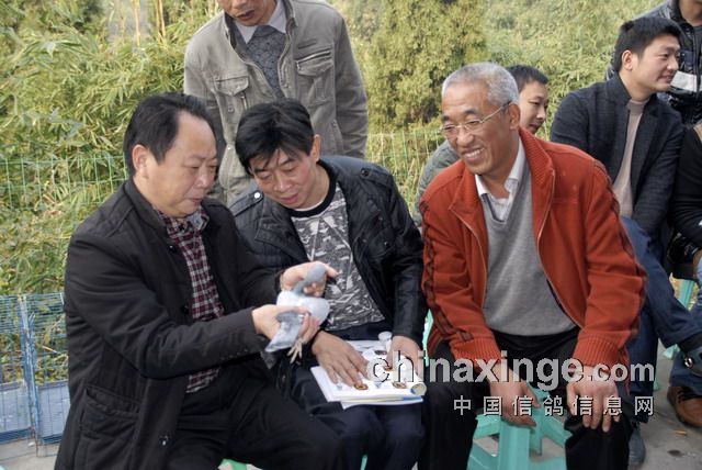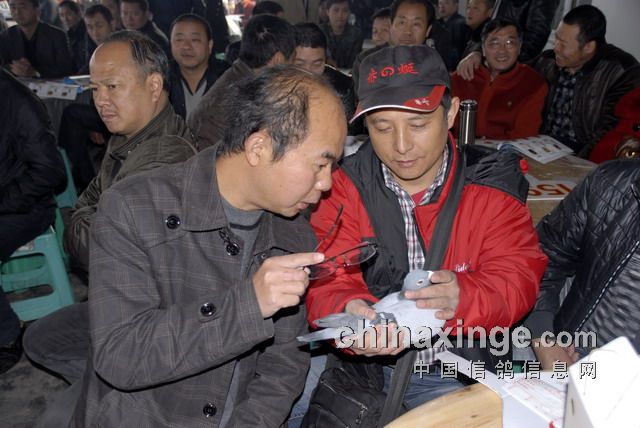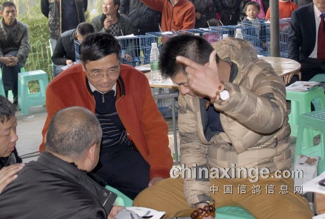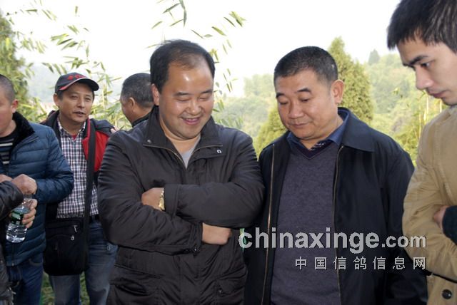 龙乡赛鸽公棚总经理李小东先生与鸽友一起欣赏拍卖鸽