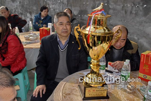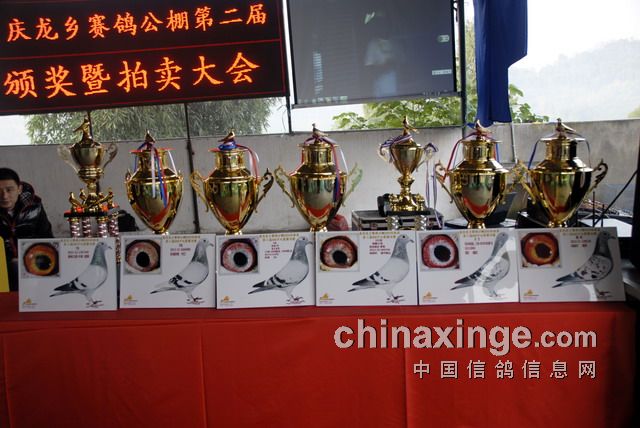 拍卖会主席台上放满了获奖鸽彩照和奖杯