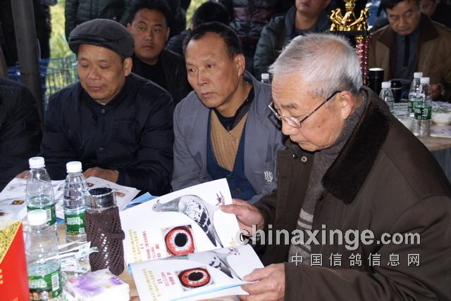 前来参加拍卖的鸽友在欣赏获奖鸽