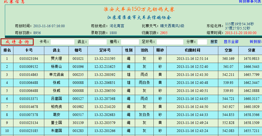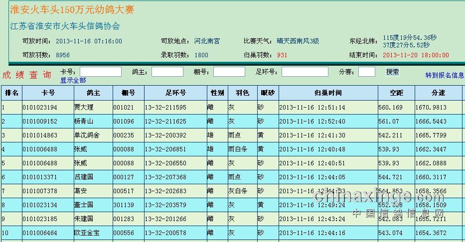 江苏省淮安火车头信鸽协会2013年150万幼鸽大奖赛,于11月16日早上7点16分在河北南宫开笼,当日共计放飞8956羽赛鸽。