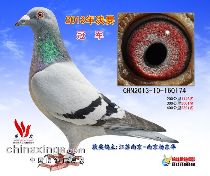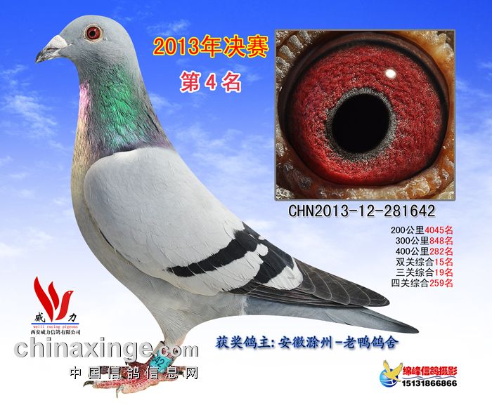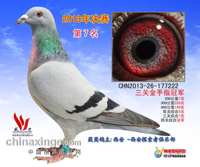 西安威力公棚决赛于11月26日打响,7点50分在山西晋中开笼,共计参赛鸽3027羽。当天天气晴,有西北风3-4级。比赛于下午15点05分见鸽归巢,仅一分钟时间,前十名全部进棚扫描。南京杨东华鸽友的13-10-160174灰鸽获得冠军,荷兰名家彼得.曼德斯的NL13-1312549雨点鸽夺取亚军,季军由赵小虎的13-05-560015灰鸽获得。以下是比赛前十名成绩与获奖鸽图片欣赏: