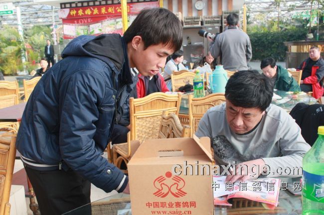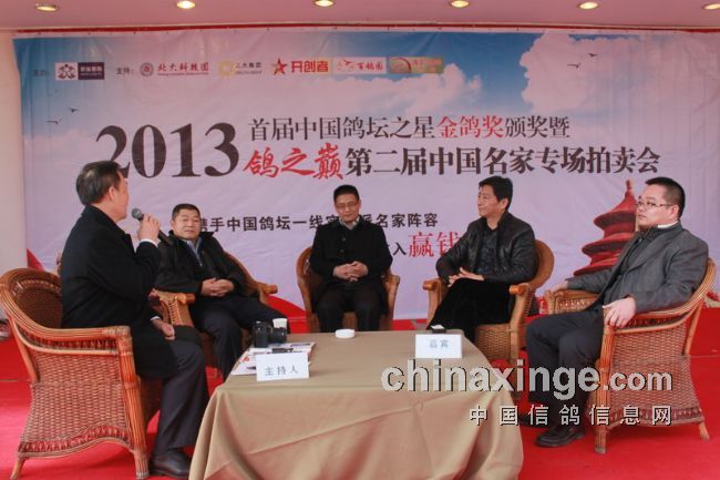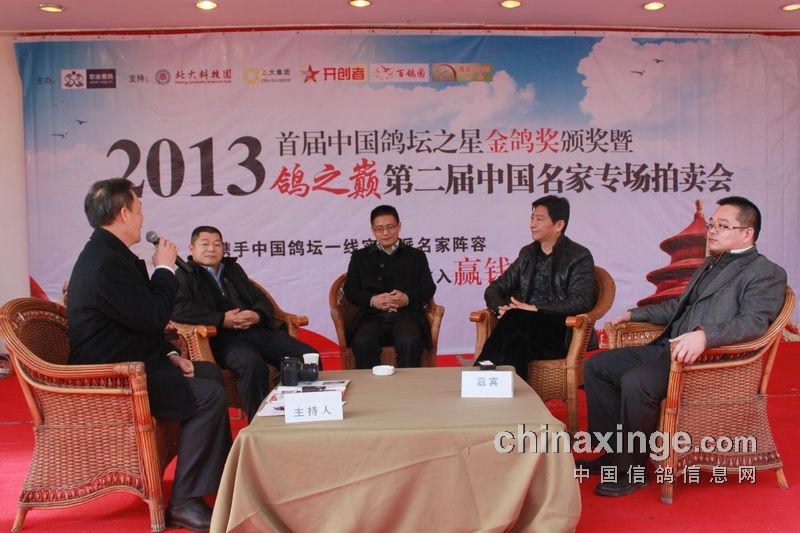 上午展示鸽,期间由北京海淀协会秘书长主持介绍应邀嘉宾。中国赛鸽网主编宋福玉先生主持小型座谈会。宋福玉先生向嘉宾提出问题,应邀嘉宾职业赛鸽网CEO申先生、开创者俱乐部老总苏先生、北京海淀协会会长凌先生和某珠宝公司老总回答并讨论。
