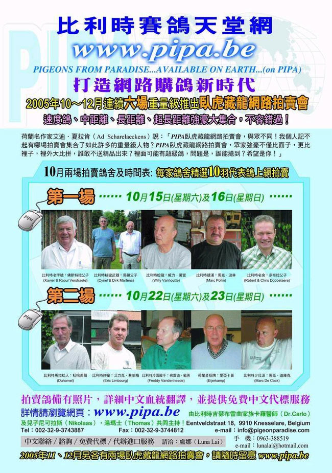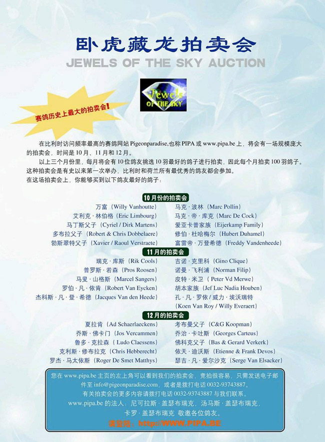 比利时赛鸽天堂网 www.pipa.be 精心筹划, 打造网络购鸽新时代 -- 卧虎藏龙网络拍卖会!