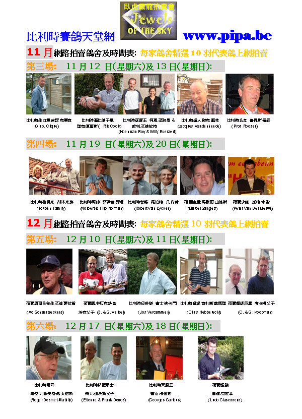 2005年10月起隆重豋场, 每月两场, 连续三个月重量级推出! 敬请密切注意比利时赛鸽天堂网: www.pipa.be