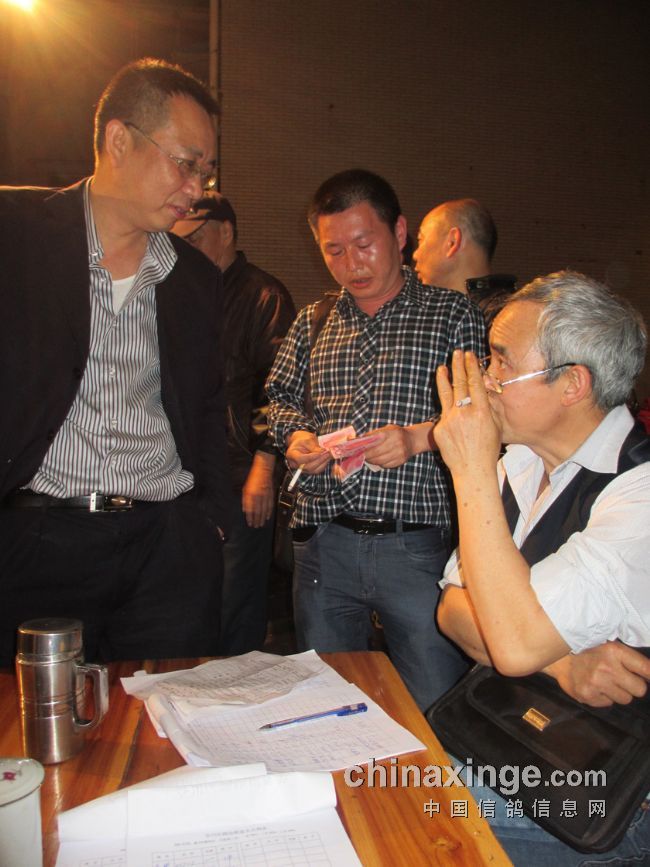 昨天集鸽2500羽左右,点鸽分四项(鸽会提5%做费用):一、每羽100元前三名冠军8%、亚军6%,季军4%,余下的归巢鸽均分;二、每羽100元让分速50米有效鸽均分;三、每羽200元奖前三名,50%,30%,20%;四、每羽300元,满十个点鸽取一名。