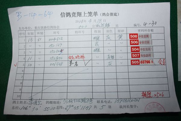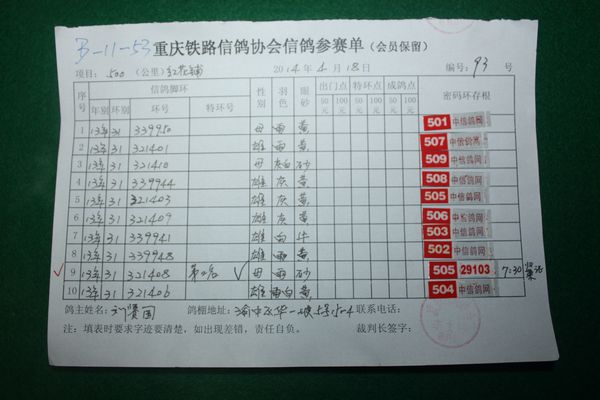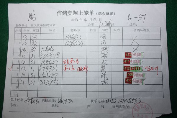 恭喜成鸽冠军江北区鸽友李道生(环号:2010-31-001328)、成鸽亚军渝中区鸽友乔勤良(环号:2012-31-079331)。