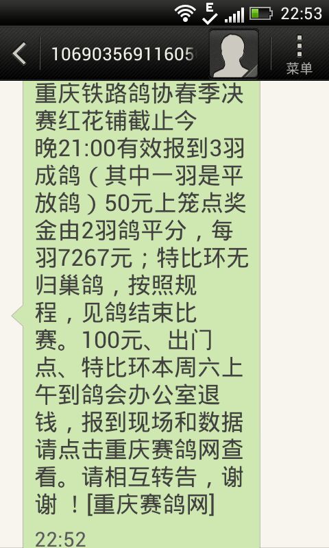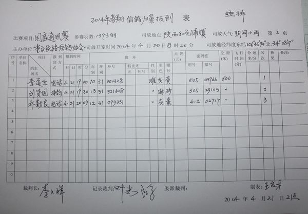 按照规程,今日(4月21日)继续比赛。截至今晚(4月21日)21:00有效报到3羽成鸽(其中一羽是平放鸽,颁发归巢证,不纳入成绩排列),50元上笼点奖金由2羽鸽平分,每羽7267元;特比环无归巢鸽,按照比赛规程,见鸽结束比赛。100元、出门点、特比环本周六上午到鸽会办公室退钱。