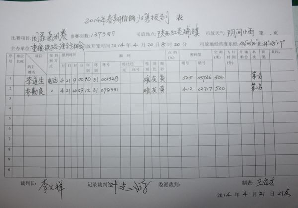 重庆铁路鸽协2014春季500公里决赛红花铺4月20日早上(8:20)放出,比赛集鸽1373羽,当天无鸽归巢。