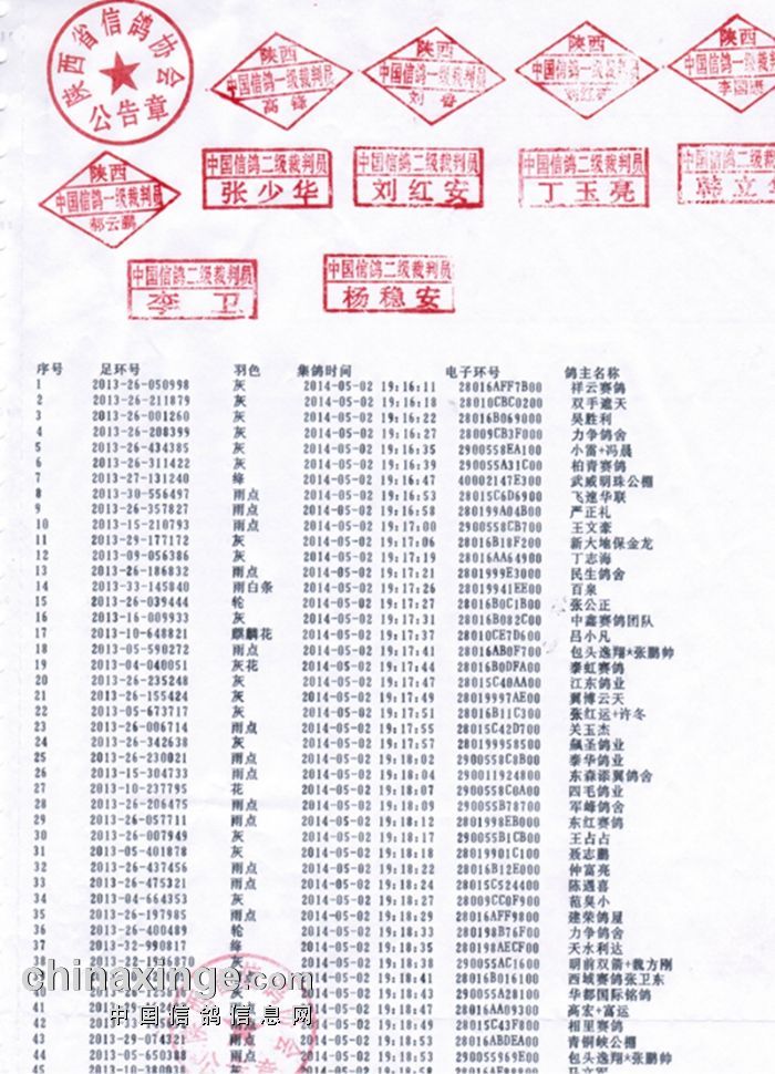 陕西天平赛鸽春棚2014年100公里训放集鸽清单(按集鸽时间)