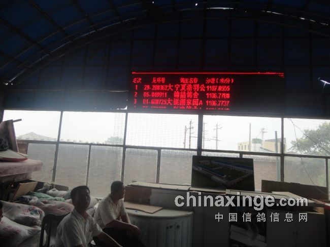 冠军宁夏浩羽公棚,赛鸽环号:2013-29-288362,归巢时间 15:05:11.281,分速1107.0555。亚军至10名分别为:内蒙锦喆鸽舍、北京银湖家园、内蒙兴建鸽业、宁夏刘国军、宁夏双福鸽舍、内蒙古黄草洼+魏氏鸽业、宁夏荣发鸽舍、姚新、卡诺亚。