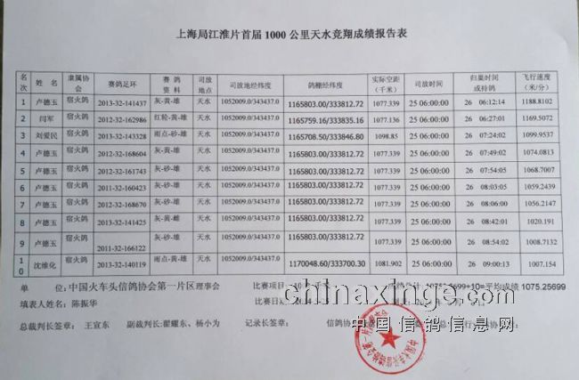 上海局江淮片首届千公里天水联翔赛于5月25日早晨6时整放出,共427羽,次日相继归巢200多羽。经过竞翔组认真审核,所有参赛鸽(表1至表6)手续齐全,符合中鸽协竞赛规程要求。竞赛结果决出前十名(成绩见附后报告表),创造了上海局鸽协近几年最好成绩。广大鸽友欢欣鼓舞,一致认为,此次联赛公开、公正、透明度高、省经费,是一次成功的竞赛。大家决心继续努力,在全国信鸽比赛中做出新贡献!