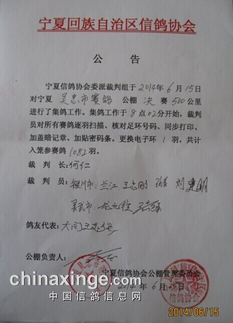2014年宁夏吴忠市赛鸽公棚500公里决赛上笼名单