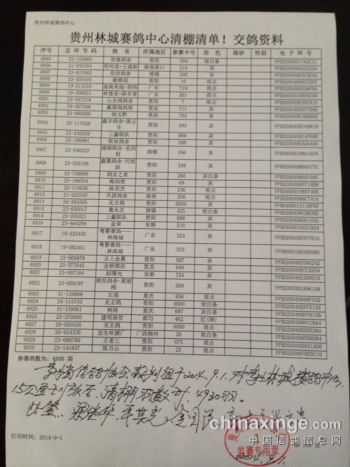 贵州林城赛鸽中心2014年清棚清棚及裁判签字照片