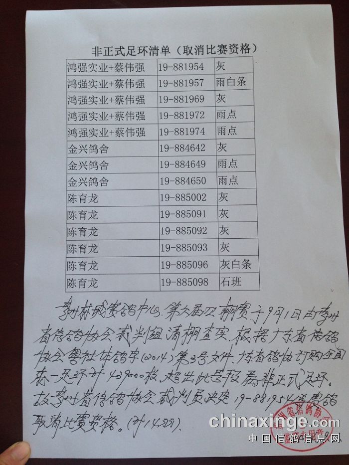 裁判组取消非正规足环赛鸽参赛资格签字照片