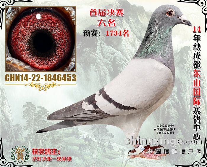 这羽鸽子得于好友“铁骑龙”余佳龙转让,是12年欧联雨点黄眼雄配对09年鹁默德黄眼雌,参加成都东山国际公棚赛,也是我2014年的公棚收宫战。四川地区接近冬季的气候,相当艰难和悬念变化,它顶住了气候的恶劣,为我闯出了一条光明路,勇夺六名。
