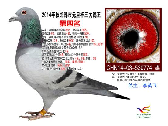 邯郸英飞鸽业,2014年秋荣获邯郸市元旦杯精英赛,4名,5名,参赛7羽赛鸽,5只进入前50名的高奖位,一羽受伤归巢。并荣获三关鸽王的第四名。