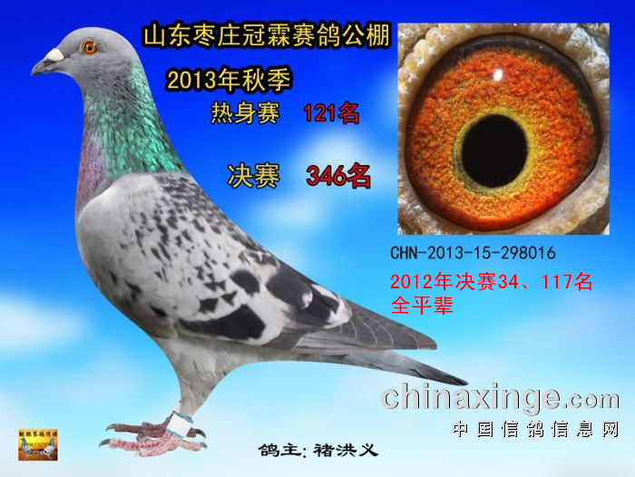 只有顶尖的种鸽才能做出好赛鸽,只有最合适的配对才能做出最好的赛鸽,346名全平辈在去年首次配对作出同窝双雄送枣庄冠霖赛鸽公棚获得决赛34名、117名之成绩。今年秋季天气反常,造成大部分快速鸽丢失,我选送4羽平辈唯有346进奖。唯幸迟归两羽加站赛550KM能全部归返,甚感欣慰。在此感谢枣庄名家吴刚、褚洪义友情支援种鸽,方能使我这新手也能获得如此佳绩,此情铭记于心。 |