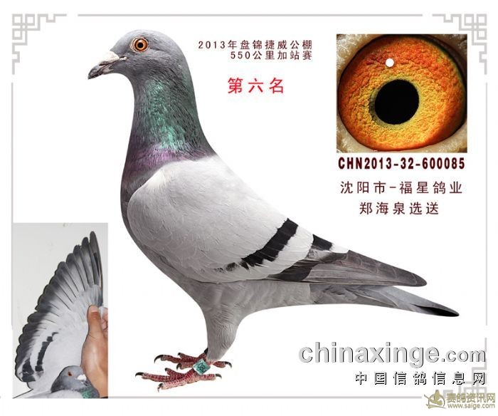 此鸽下窝时就很健康强壮!是一羽雄鸽。但是决赛时却出乎预料的令我失望了!我很难过!还好在后面的赛事里它为自己的主人,飞出了主人本应有的尊严!