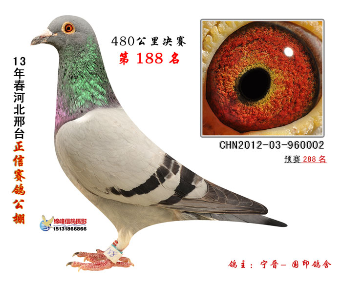 13年邢台正信公棚决赛188名,其兄妹邢台柏乡信鸽协会480公里普赛6名,晨旭特比环季军。