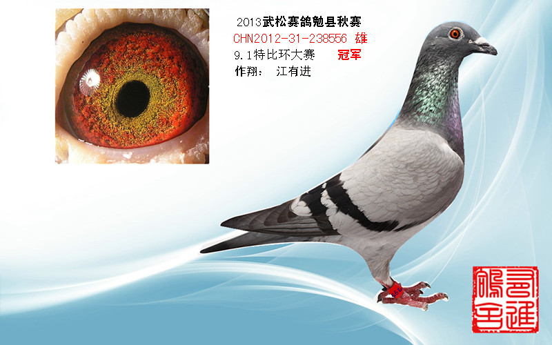 2013年9.1《勉县》武松赛鸽特比环保底15万元大奖赛.决赛集鸽1369羽。空距420.由于天气不好当日无有效归巢鸽,第二天有效归巢16羽,本鸽获得冠军。是桑杰士配白腹号的血统。越是艰难的赛事越能体现赛鸽的价值。