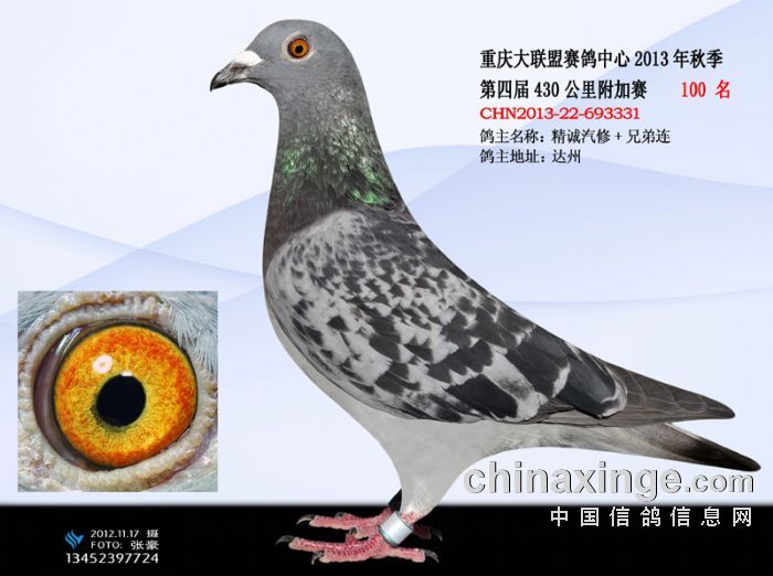 2013年重庆大联盟公棚加站赛100名,同父同母哥哥在成都渔樵公棚春赛获鸽王28名