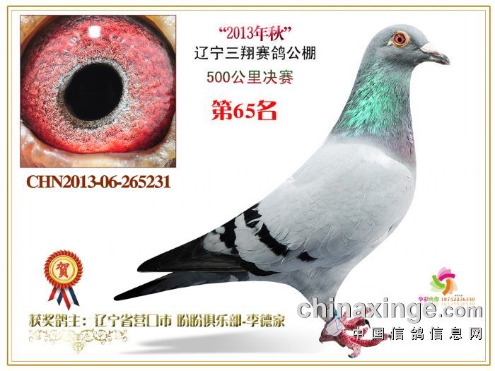 辽宁三翔公棚 决赛上笼5038羽.空距502公里.决赛65名.血统詹森019*桑杰士.4月25出.6月15号送公棚. 父亲是金盾公棚59名.母亲是雪松大奖24名.