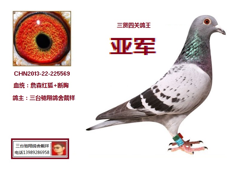 13年三贤鸽王亚军、血统:【红狐731+断胸】+【三台驰翔鸽舍】500公里亚军。