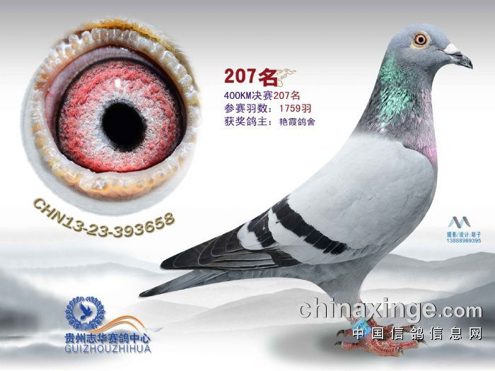 今年我参赛的赛事进入尾声,我的参赛鸽取得了一些较好的成绩。有两羽赛鸽入赏;2012-23-388285灰雄在500公里汽车大奖赛中获得386名成绩<取450名》。有一羽2013-23-393658雄灰在贵州志华赛鸽中心秋棚决赛中获得207名,帮我赢取3000元奖金。不管成绩如何,能入赏的就很开心快乐。2013-23-393658这羽公棚参赛鸽,它的父亲是胡本的后代,母亲是詹森的后代。明年争取更好成绩。