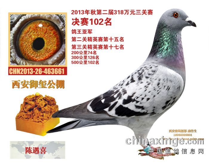 13年秋 玉玺公棚鸽王亚军 200公里74名,300公里126名,500公里102名!