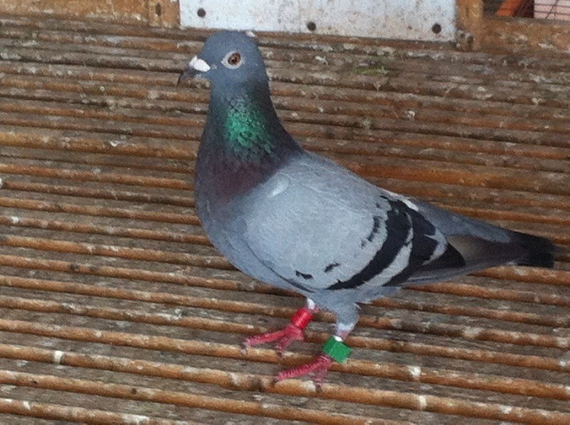 环号2012-17-175016灰黄眼雌,血统:电脑戈马力X胡本 赛绩:2012年秋季500公里新郑特比环651羽9名,幼鸽赛新郑500公里786羽季军;2013年秋季信阳300公里850羽冠军,许昌480公里732羽冠军、指定鸽冠军。