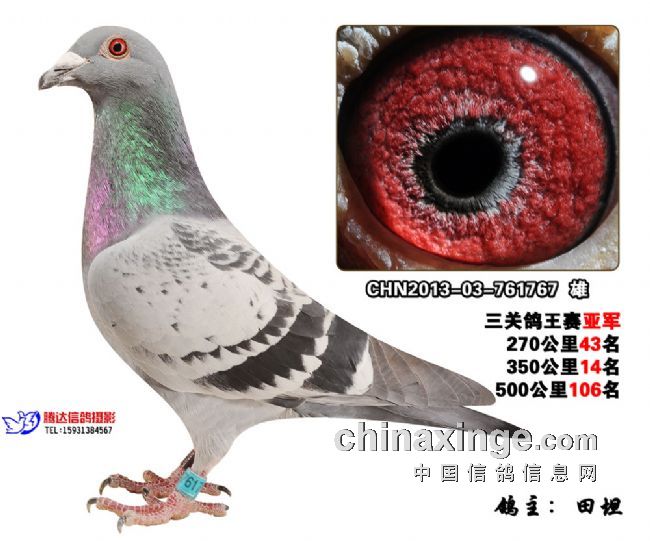 定州市信鸽协会组织2013年秋赛。 270公里1800羽43名 350公里1500羽14名 500公里1500羽106名 鸽王亚军 血统:詹森X幕利门 此鸽从小到大,个体一直表现优秀,经过比赛的考验终于为自己正名,平辈飞出270公里亚军,350公里第十。为本人赢得多项指定。 爱鸽不多说,自己开心就好