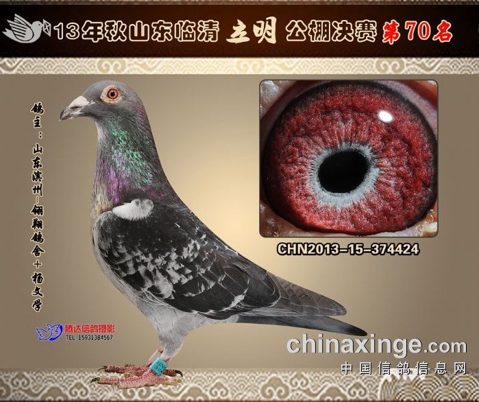 环子号2013-15-374424雨点雄。山东临清立明公棚500公里70名双关95名,决赛上笼2767羽,詹森麦克斯*桑杰士