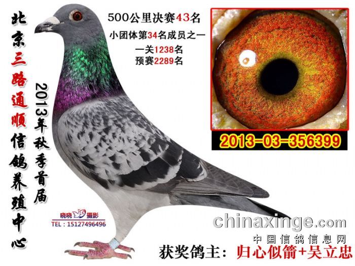 此羽雨点雄鸽为一代配四代近亲做出,同父异母哥哥08年华东春季公棚决赛冠军,平辈和下一代成绩鸽无数。父亲是乔斯托内小花直系,03年老雄;母亲为惠翔公棚10年决赛84名,是03年老雄鸽的曾外孙女。399这羽鸽子是一窝双雄,他是大雄。两个鸽子长得一模一样。