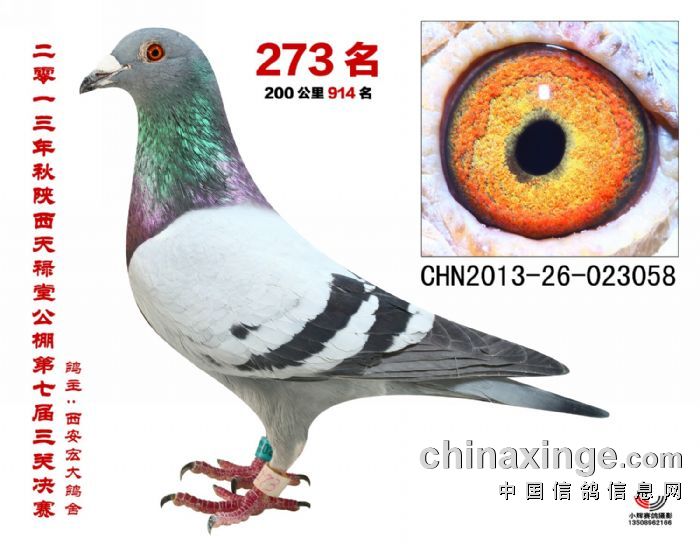 2013年秋季480公里决赛273名,灰,黄眼,血统:乔斯托內x戈登,此鸽为同父异母所出,此路血统特点:耐翔,稳当,有速度。