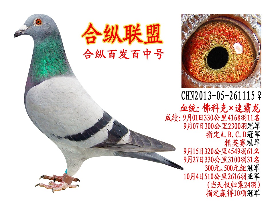 合纵白发百中号 血统:佛科克*速霸龙 本身2013年9月1号330公里4168羽11名9月7号300公里2300羽冠军指定A.B.C.D冠军精英赛冠军9月15号320公里4549羽61名9月27日330公里3100羽31名300元,500元一把抓冠军10月4日510公里2616羽亚军(当天仅归巢24羽)指定赢得10项冠军