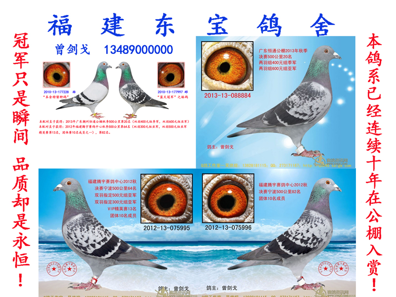 福建东宝鸽舍获得2013年广东潮州恒通公棚秋季500公里决赛第20名,父母与兄弟鸽。