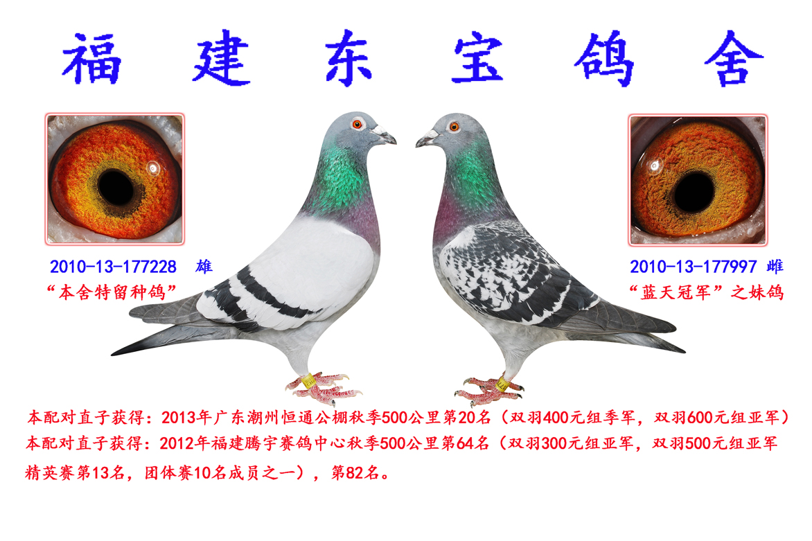 福建东宝鸽舍获得2013年广东潮州恒通公棚秋季500公里决赛第20名,父母鸽。