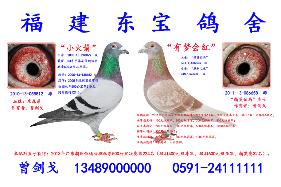 福建东宝鸽舍获得2013年广东潮州恒通公棚秋季500公里决赛第214名,父母鸽。