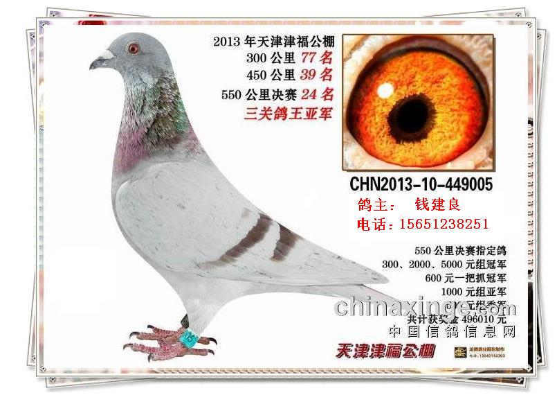 2013年天津津福公棚第十三届300公里、450公里、550公里三关鸽王亚军的一羽小雄鸽,在300公里第一关六多羽赛鸽中获77名、第二关450公里五千多羽赛鸽中获39名、第三关550公里五千多羽赛鸽获24名。它是一羽难得的种、赛鸽现给给大家品鉴。具体赛绩详情见图片。此鸽的血统是;红狐094 X 巴腾伯格。这路配对可称得上是我棚的黄金绝配,其子代和更多地方、公棚赛绩可登入中信网各地鸽舍常州红逸赛鸽rqp去欣赏。