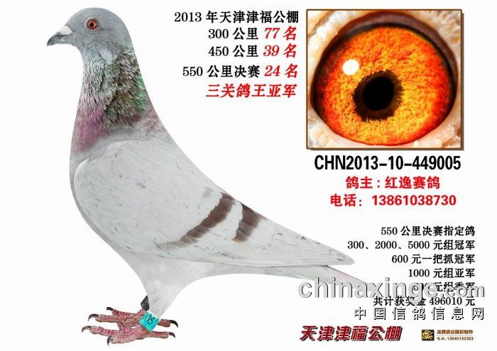 红逸赛鸽rqp:红鸽是本棚的经典赛鸽,它在地方赛屡屡建功,公棚赛屡次赢大奖。今天就给大家带来一羽今年在中高端公棚获奖的一羽高端赛鸽。 2013年天津津福公棚第十三届300公里、450公里、550公里三关鸽王亚军一羽小雄鸽,在300公里第一关六多羽赛鸽中获77名、第二关450公里五千多羽赛鸽中获39名、第三关550公里五千多羽赛鸽获24名。它是一羽难得的种、赛鸽现给大家品鉴。具体赛绩详情见图片。此鸽的血统是;红狐094 X 巴腾伯格。这路配对可称得上是我棚的黄金绝配,其子代和更多地方、公棚赛绩可登入中信网各地鸽舍常州红逸赛鸽rqp去欣赏。