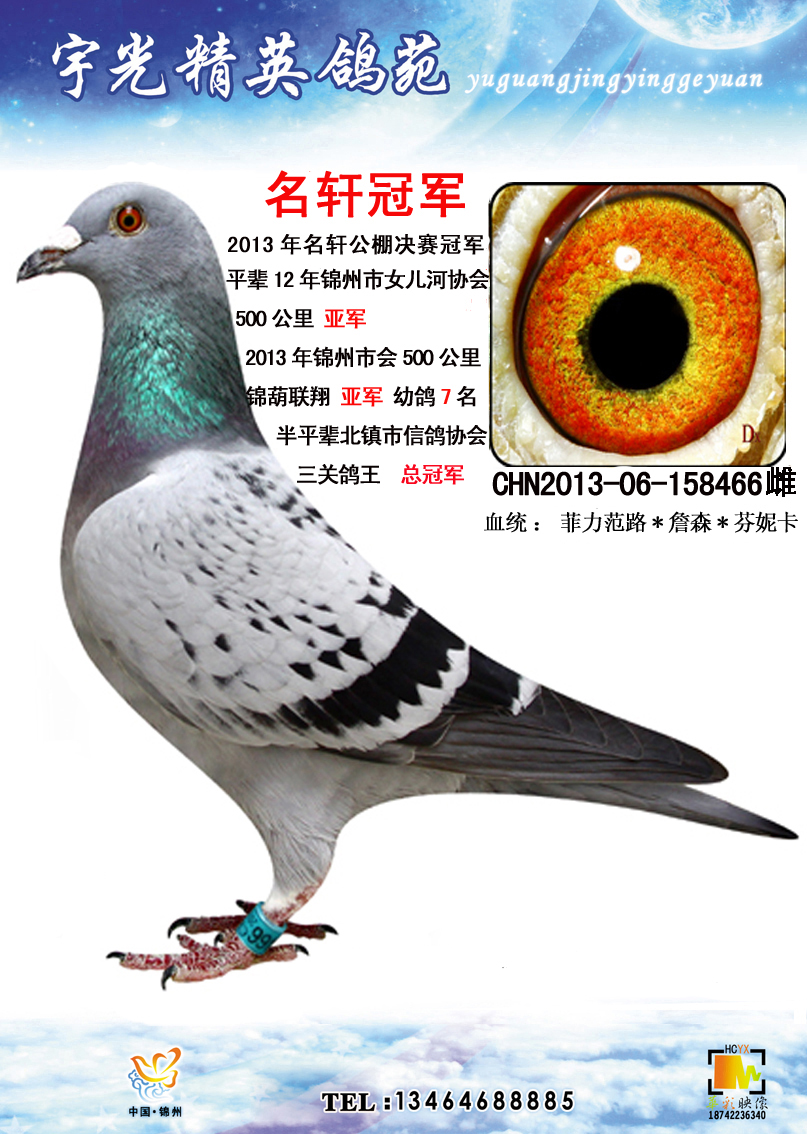 风凤雨雨十余年,为了信鸽,为了爱好,我选择了他们可爱的小精灵《鸽子》2013年特别收获的一年,有本舍作出的2013-06-158466雨点雌,血统:菲力范路*詹森*芬妮卡 获得了2013年辽宁营口名轩公棚500公里决赛冠军。是这可爱的小精灵给了我更加信心,我会在这鸽子的天空中继续翱翔,努力做好每一件事情。借助中信网2013年荣耀时刻秀出我的获奖鸽。名轩冠军