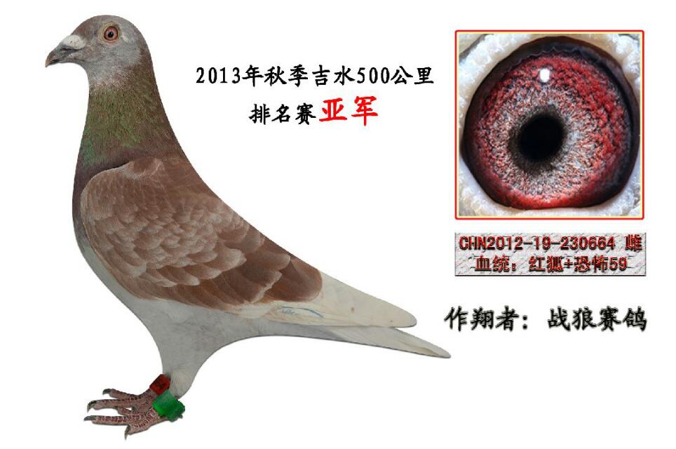 CHN:2012-19-230664 雌鸽 血统:红狐+恐怖59 本身赛级:2013年春第一关64名、第二关亚军、双关综合7名、2013年秋季520公里总排名亚军、520公里鸽王赛冠军、520公里精英赛冠军、520公里花鸽赛冠军、520公里广佛联赛佛山赛区总冠军、520公里团体赛亚军。。。。。