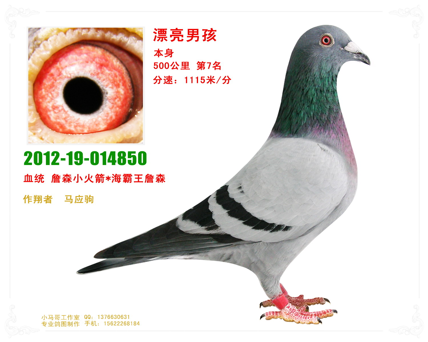 广州荔湾艺丰赛鸽俱乐部13年秋季500公里吉水大众排名赛.参赛羽数795羽,总排名第7名。血统是詹森小火箭配海霸王詹森。 一直以来,海霸王詹森鸽在网上铺天盖地的商业宣传,令我对海霸王詹森鸽的作用将信将疑。2011年引进了CHN05-19-149412石板雄后,就开启了我海霸王詹森的育种之旅。2013年,这羽石板雄的外孙获得了500公里第7名的好成绩,不禁更深刻觉得“铭鸽出自铭血”的道理。