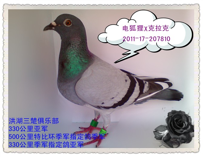 2011-17-207810灰白条雌 血统为电狐狸X克拉克 赛绩:2011年秋330公里862羽亚军;两市两县特比环新郑517公里1142羽季军、指定鸽季军;330公里1318羽季军、指定鸽亚军。当年参赛三次,三次前三名,当时不足9个半月。