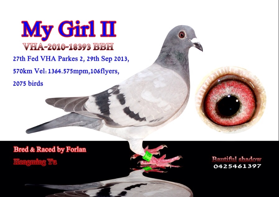 华澳鸽园—my girl II,她以1364.575米/分的速度拿下VHA联合会570km,27名的成绩!106会员,2075羽比赛!第四次杀进联合会前30!虽然名次不是十分靠前但是连续3周4场比赛都能入赏,这对于第二年在澳洲参赛的我来说是没有想到的!甚至连很多澳洲鸽友都对我竖起大拇指!来和我握手致贺!同时我也是非常的高兴! 血统:盖比X凡龙