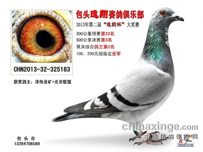 | king8831:艾薇儿,雌鸽,黄眼,灰白条,环号CHN2013-32-325183,包头逸翔公棚2013年鸽王亚军:公棚收鸽8326羽,清棚6420羽,180公里6千多羽获得256名,预赛上笼5620羽获得23名,决赛上笼4715获得季军;预赛晴天大量高速归巢的情况下,与冠军同归;决赛日艾薇儿飞翔8小时,与冠军仅差3分钟归巢,当天归147羽。本届比赛由于预赛24名没有交费取消名次,后面的名次递进,导致艾薇儿只因一名之差失去鸽王冠军头衔,成为卫冕之王,实为可惜。优秀赛鸽自然有其与众不同之处,整体紧凑,龙骨坚硬修长,前端却略有隆起;翅膀关节圆滑,肌肉饱满;最后三根大条齐平,第四条与之相差不多;经过短期饲养,艾薇儿已经没有丝毫畏惧感觉,与主人打成一片。遗传的重要性在我们养鸽人中有一定的共识,血统的延续才能保证赛绩的传承;艾薇儿的父母就是很好的血统鸽,做出大量成绩优秀的赛鸽,子代和孙代在近几年的公棚赛中有十数羽获得前奖,仅2012年就有5羽同血缘赛鸽获奖。希望新的一年里在这些优秀种鸽的基础上,鸽舍主人可以再续辉煌;同时祝愿“秀出你的获奖鸽”活动圆满成功,年年有惊喜;祝愿中信网越办越好,年年红火。 |