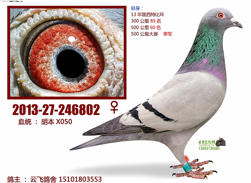 2013年陇西鸽协预热赛300公里85名,大奖赛300公里60名,决赛520公里季军,再次感谢好友王智新鼎力支持,预祝2014年取得更加辉煌的成绩!