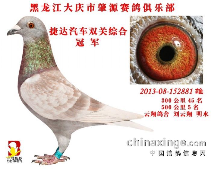 黑龙江肇源赛鸽俱乐部2013年秋300公里预赛45名,500公里决赛5名 与冠军同时归,荣获双关鸽王亚军,捷达汽车大奖赛冠军赢得2013款全新捷达轿车一辆。同时获指定鸽A组冠军,B组亚军,C组冠军,D组冠军,E组冠军,F组冠军,G组冠军,现场挑战赛200元组冠军,500元组冠军。