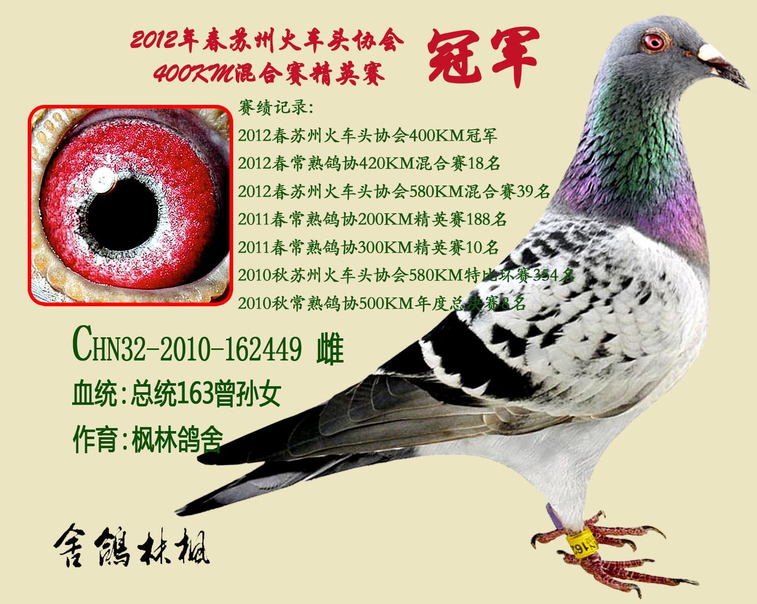 400公里冠军,500公里8名,常熟枫林鸽舍。